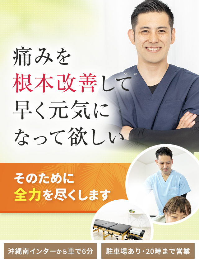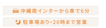 沖縄のインターから車で6分、駐車場完備でお車でも安心です。夜20時まで営業・完全予約制のため、お仕事やお出かけ帰りでもスムーズにご来院いただけます。